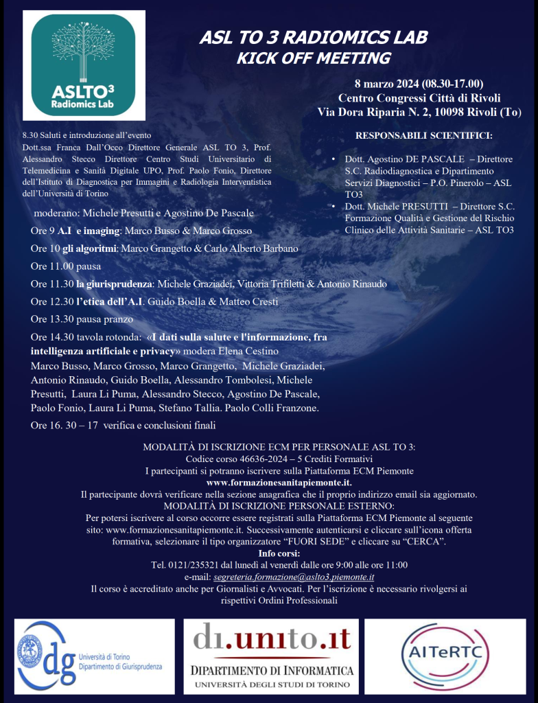 Il giorno 8 marzo 2024, presso la Sala congressi del Comune di Rivoli (TO), AITeRTC ha patrocinato l’evento di inaugurazione del primo Laboratorio di Radiomica per cure personalizzate, ideato e realizzato dal collega Marco Grosso: https://www.aslto3.piemonte.it/i-dati-sulla-salute-fra-privacy-e-intelligenza-artificiale-nasce-il-primo-laboratorio-di-radiomica-in-aslto3/