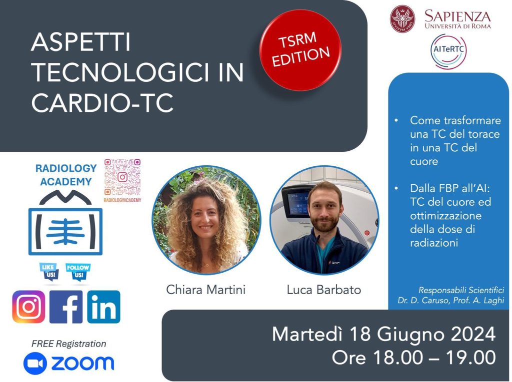 La Radiology Academy, coordinata dal Dott. Damiano Caruso e dal Prof. Andrea Laghi apre le porte ai TSRM, dedicando il Terzo Episodio del ciclo di webinar sincroni dal titolo Aspetti tecnologici in CardioTC. AITeRTC, onorata dell’invito, sarà rappresentata dal TSRM Dott.ssa Chiara Martini (Presidente) e dal TSRM Dott. Luca Barbato (Componente Comitato Scientifico) che ci parleranno dell’evoluzione tecnologica avvenuta nel campo della cardiosincronizzazione e della riduzione della dose di radiazioni.