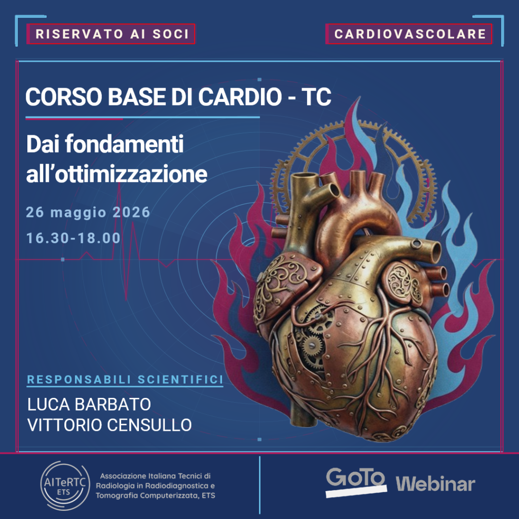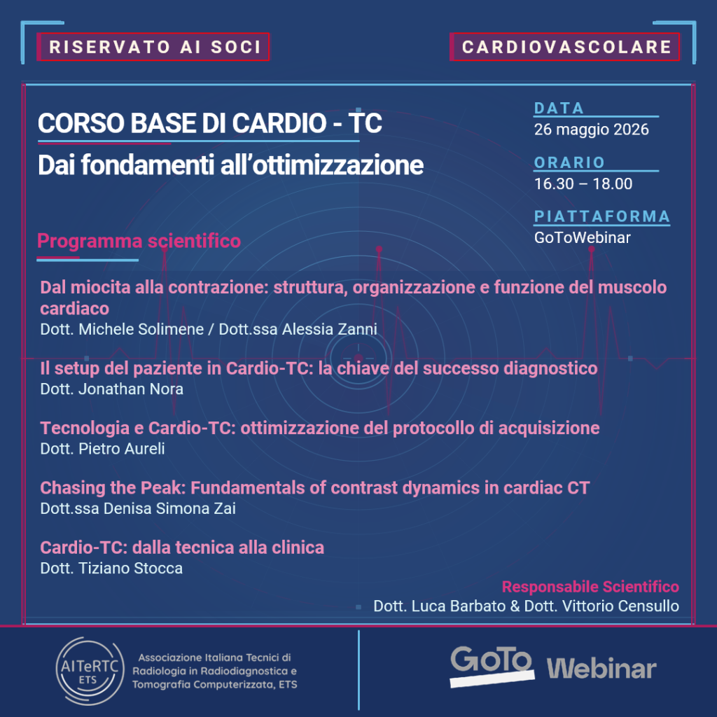 Nel contesto del programma formativo dedicato all’imaging TC cardiaco e vascolare proposto dal Gruppo scientifico del Distretto Cardiovascolare di AITERTC ETS martedì 26 Maggio 2026 alle ore 16:30 è calendarizzato il primo evento webinar online.